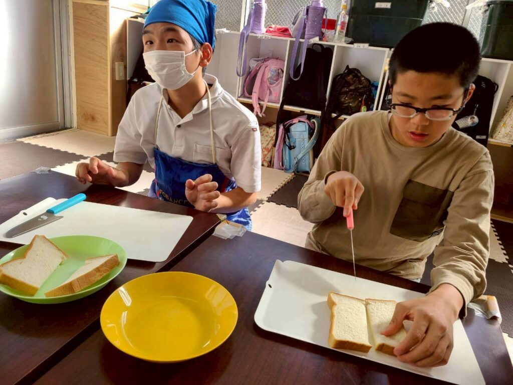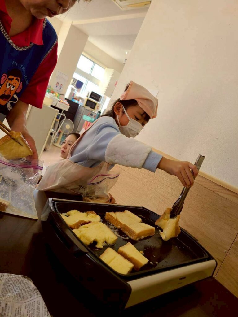 フレンチトースト作りでは、焼く工程で手首を上手に動かしてひっくり返していました👏パンが柔らかく、形が少し崩れてしまう子もいましたが、食べる時には「おいしい!」と言って食べていました😊