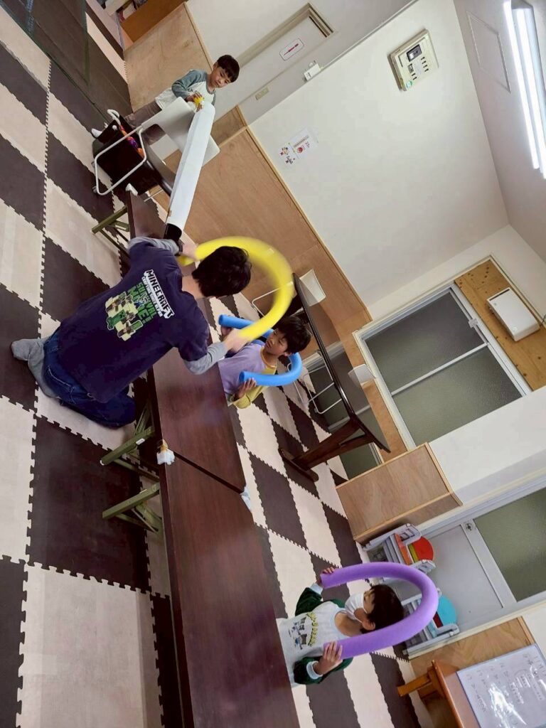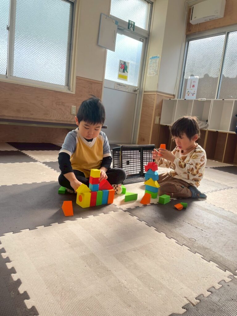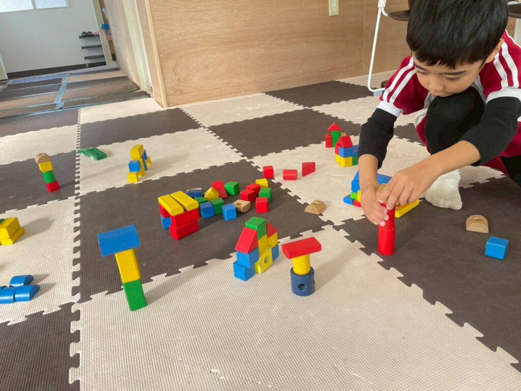 「これは家だよ。」「ロケット作る。」「椅子作った。」と様々な形を組み合わせながら、イメージした物を作りあげていく子どもたち。