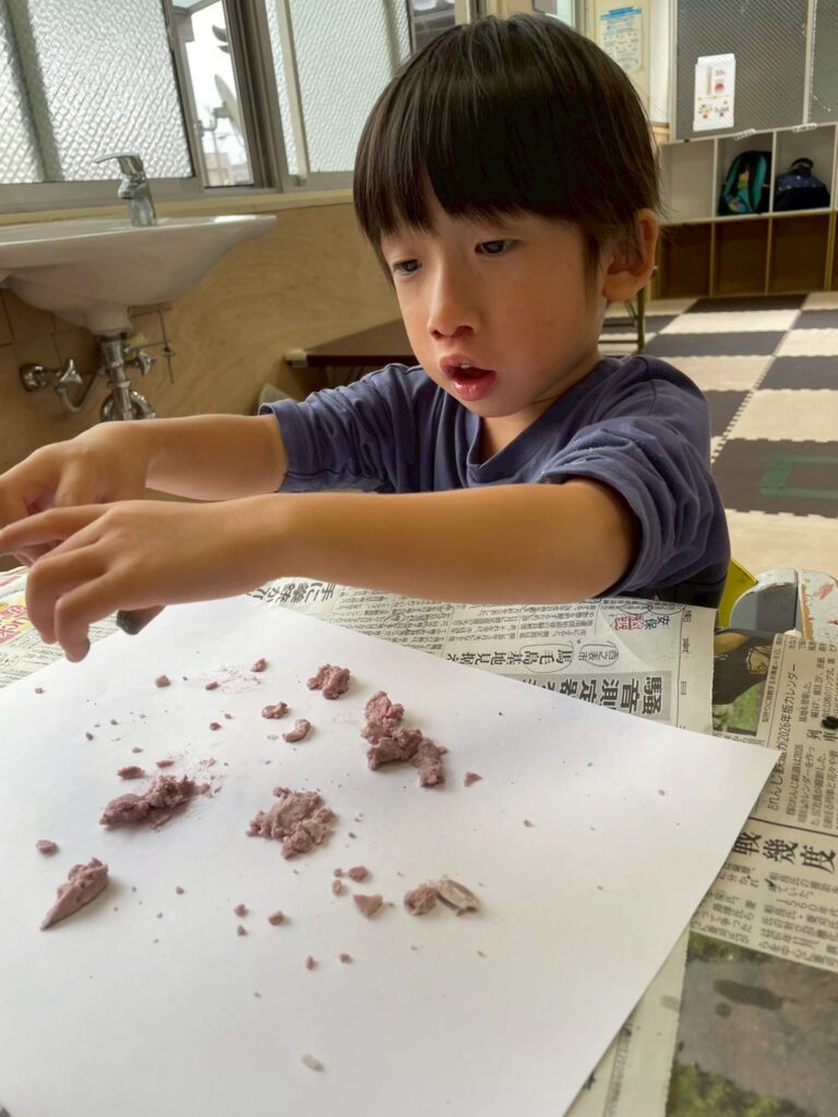 いざ、つぶ砂に触れてみると「なんだこれ?」と不思議そうな表情を浮かべたり、「おもしろい!」と指先で潰したりこねたり・・・