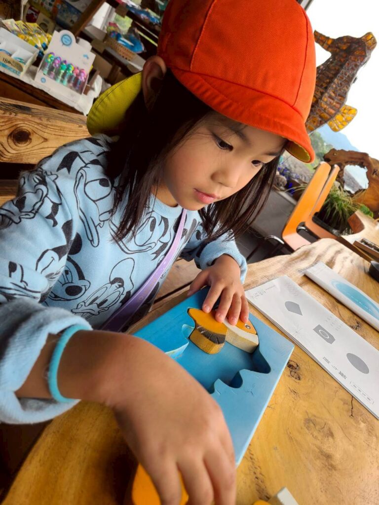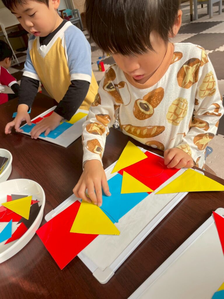 三角と三角を合わせて「四角になった!」と形の変化や発見も楽しんでいました♪