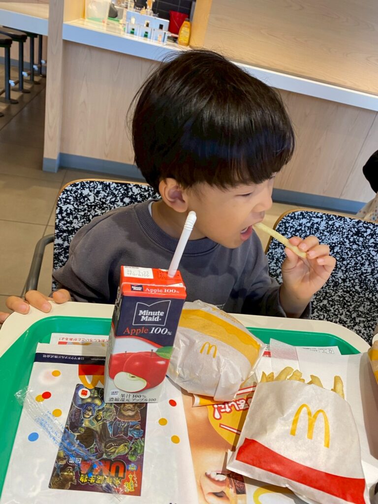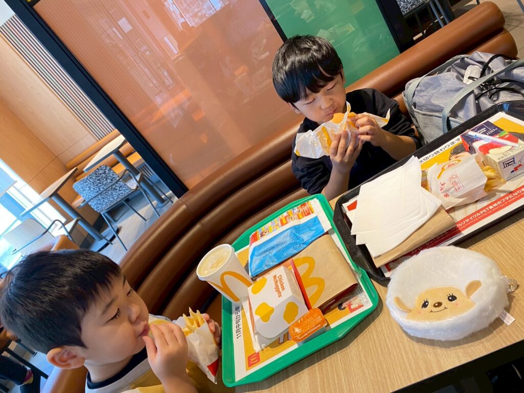 お昼はマクドナルドで購入体験をし、みんなで食べました。ドキドキしながらの注文を終えた子どもたちからは笑顔も見られ、「何にした?」「おもちゃ楽しみだね!」「おいしいね。」と会話も弾んでいました☺