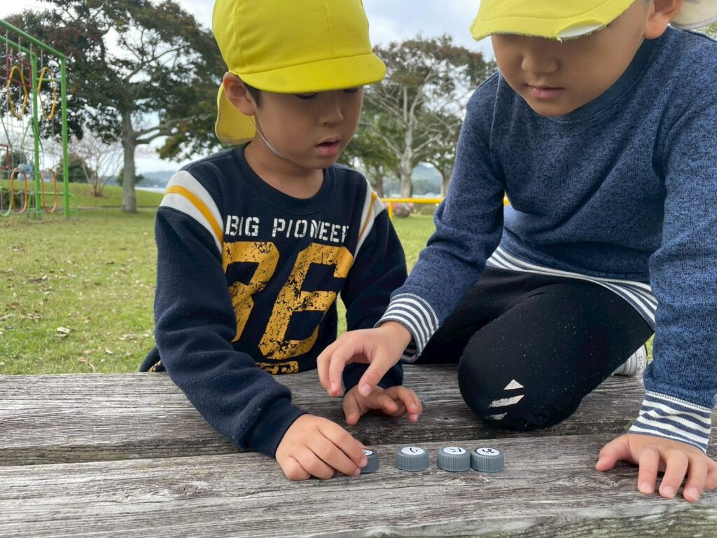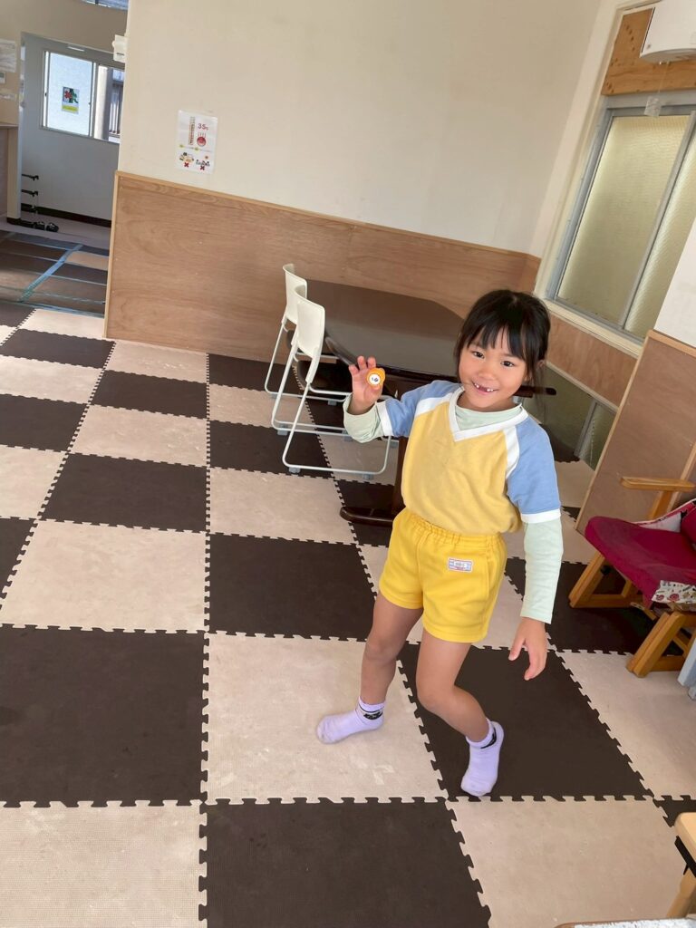 宝探しゲームでは、ペットボトルのキャップを使って行いました!小さなキャップを上手に隠しており、探す側の子たちは、見つけることに苦戦!上手に「ヒントください!」と言っていました✨