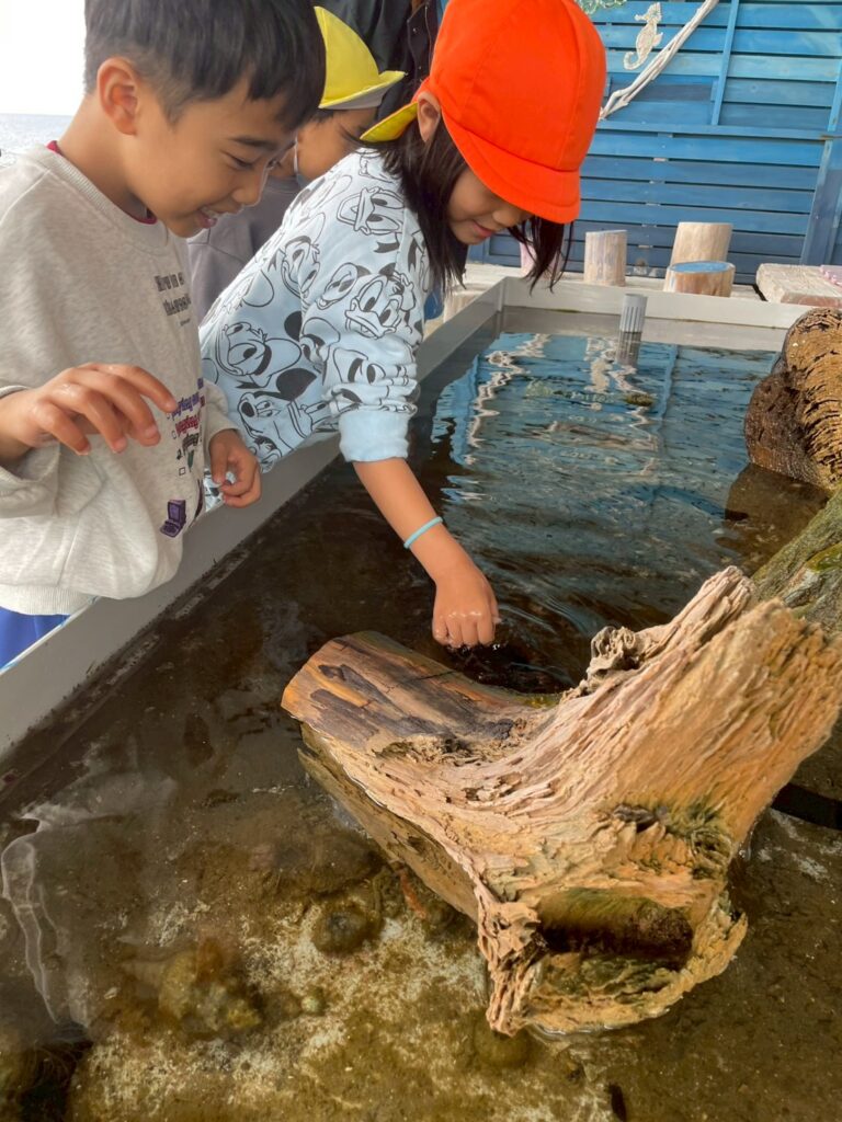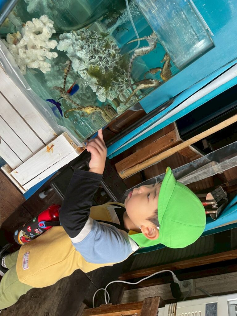 「いっぱいいるね。」「こっちに何かあるよ。化石みたい。」などお友だちとのやりとりも見られ、タツノオトシゴに釘付けな子どもたち☺ふれあいコーナーでは、なまこに触れ「ぬるぬるする。」と大騒ぎでした!!