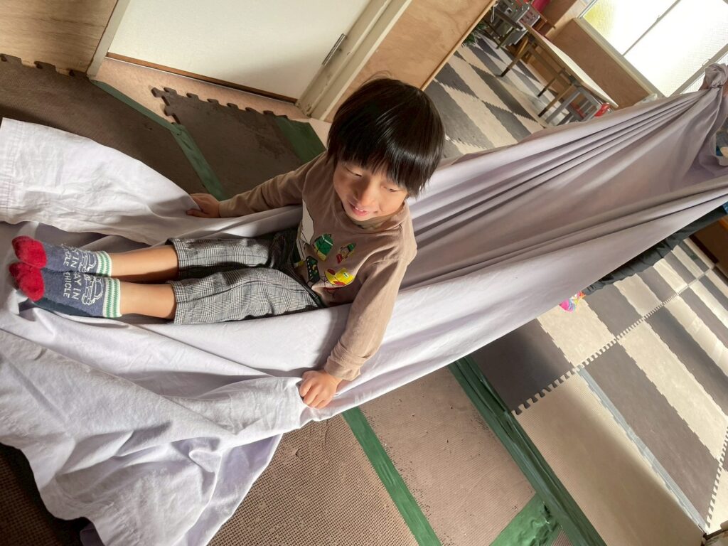 体を使った遊びでは、しっぽ取りゲーム・タオル綱引き・シーツ遊びをしました。