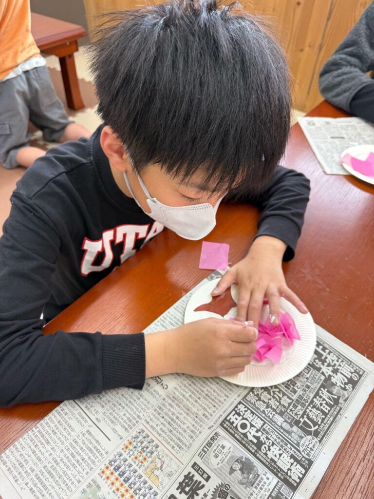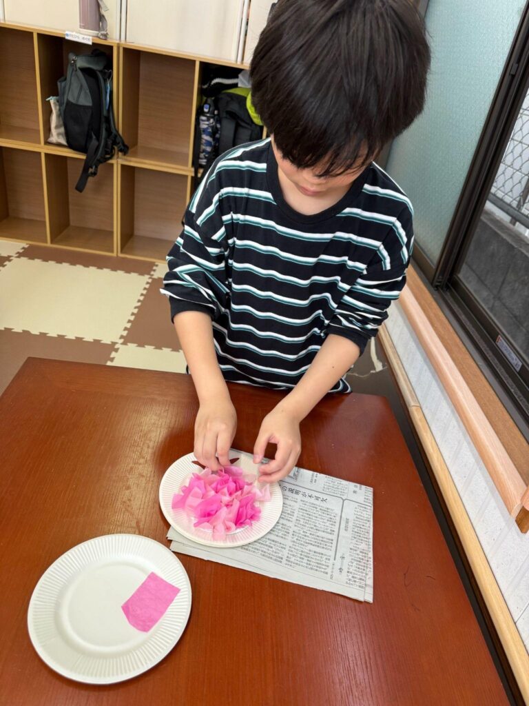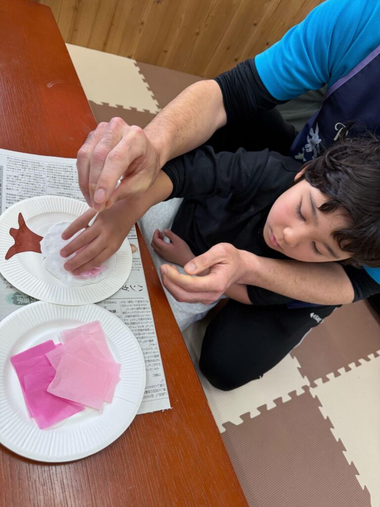花紙が沈んで花びらのように変化する様子を楽しみながら、一つひとつの工程にじっくり向き合う姿が見られ、集中力を育む時間となりました。 力の入れ方を工夫しながら繰り返し取り組むことで、自分なりに考えて表現する姿も見られました。完成した作品にはそれぞれの個性が光り、達成感につながっています。