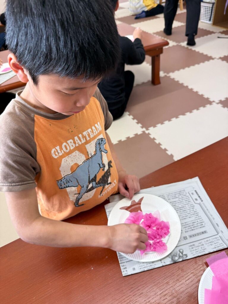 桜の制作に取り組みました。紙粘土に花紙をのせ、綿棒で押して桜の木を表現しました。